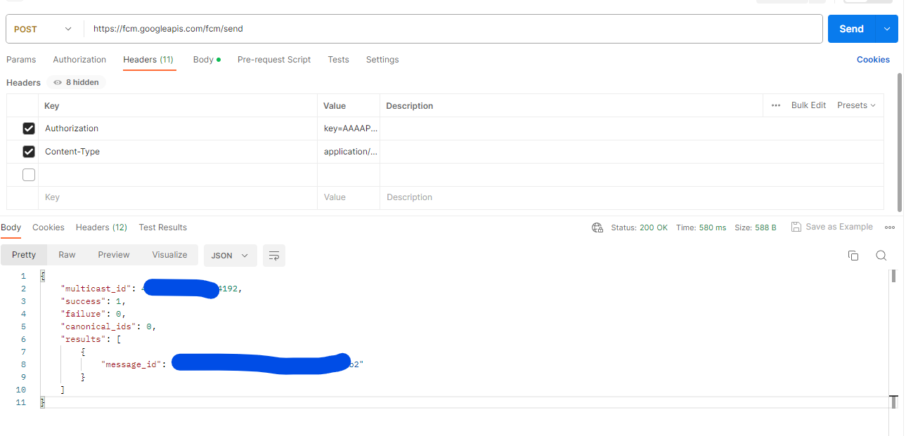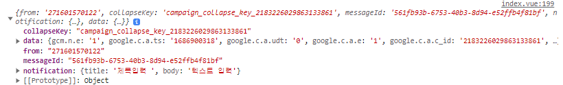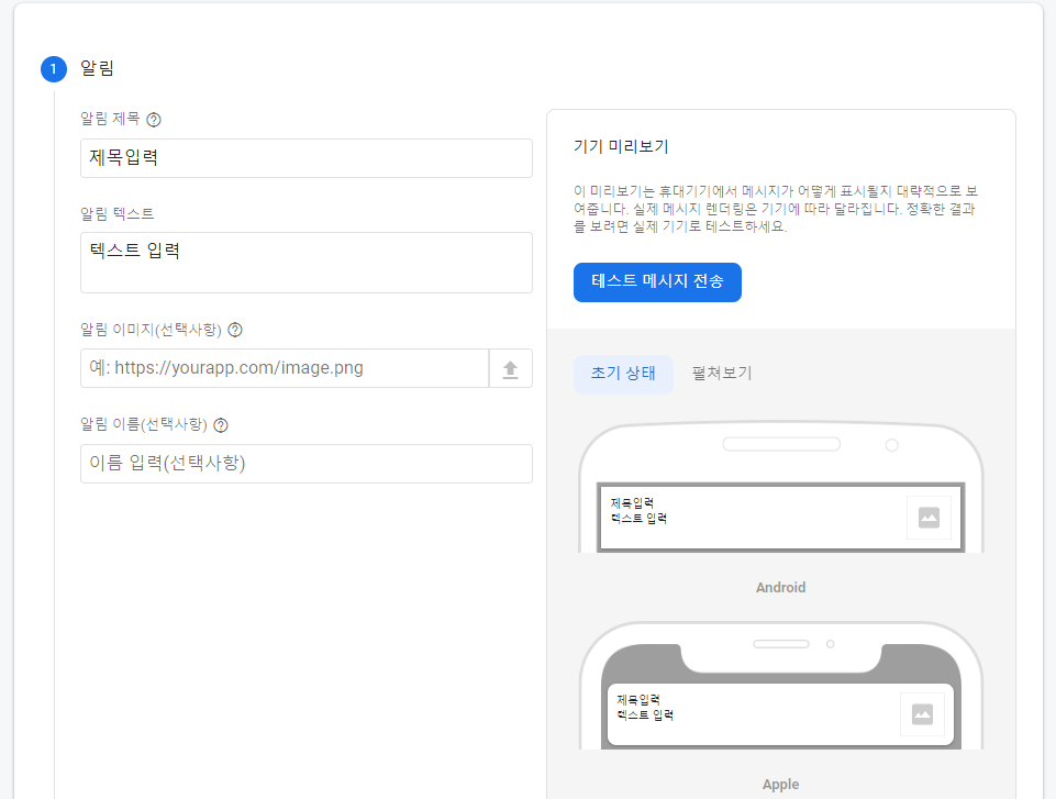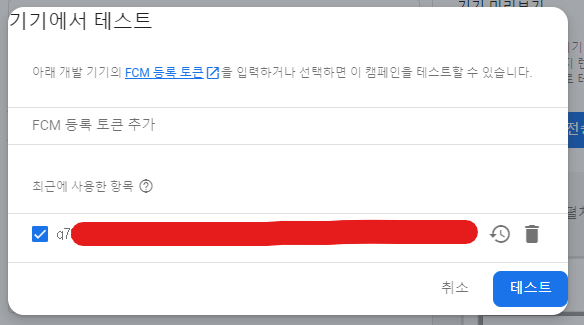 테스트 메시지 전송에서 FCM등록 토큰 추가를 할 수 있다.