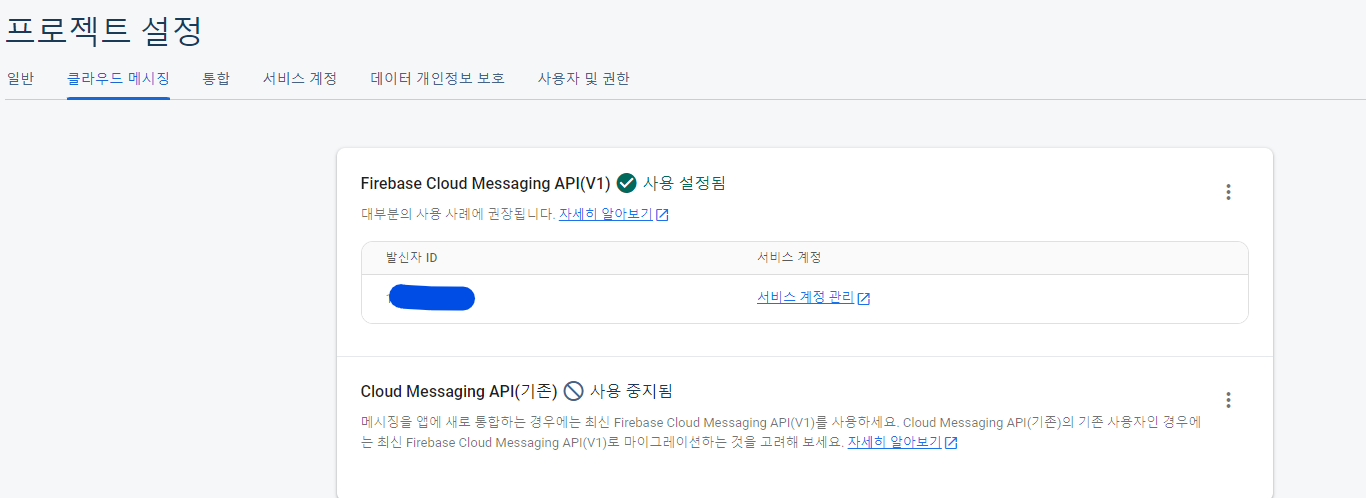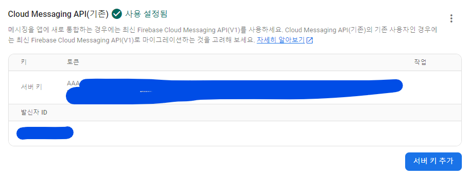 이와같이 사용 중지됨이 나올 경우 오른쪽 점3개 아이콘클릭 > Google Cloud Console에서 API 관리 클릭 > Cloud Messaging 사용 클릭 후 뒤로 돌아가 새로고침하면 볼 수 있다.