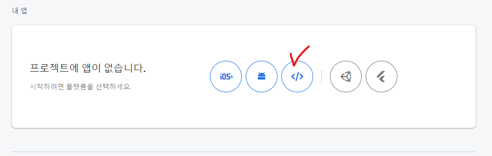 보이지 않을 경우 "앱 추가" 를 해야 한다. 추가 시 지금 설명은 웹을 기준으로 설명 하고 있으므로 </> 웹을 선택해서 추가하면된다.