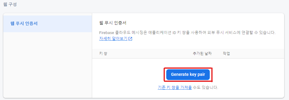 웹 푸시 인증서는 "프로젝트 설정 > 클라우드 메시징" 페이지에 "웹 구성" 을 보면 웹 푸시 인증서를 발급 받을 수 있다.