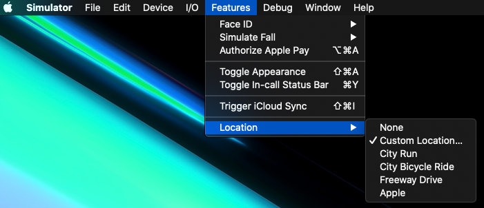 Simulator -> Features -> Location 에서 Custom Location 을 선택하세요.