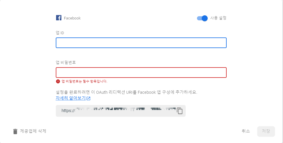 아까 복사해두었던 앱ID와 앱시크릿코드를 기입해주도록 합니다.